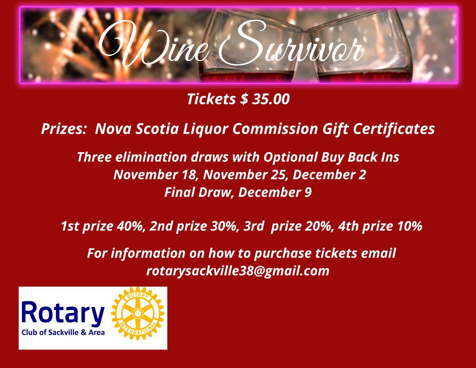 Tickets for Wine Survivor 2025 are now available!! Win NSLC Gift Certificates!! Tickets $35.00 with 3 buy back chances $5.00 each....so even if you don't win on the 1st round you can still have chances. Email rotarysackville38@gmail.com for instructions on how to purchase your ticket! Many thanks! Let your love of socializing go to great causes...Literacy, Polio. Hunger and Homelessness, Families-In-Need.