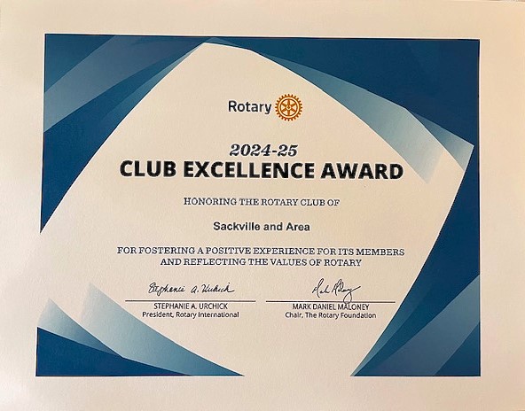 We are so proud of our Club. For the year 2024 - 2025, Rotary Club of Sackville and Area has received the Club Excellence Award. Lots of hard work, lots of fun, and lots of community involvement and caring. Congratulations.